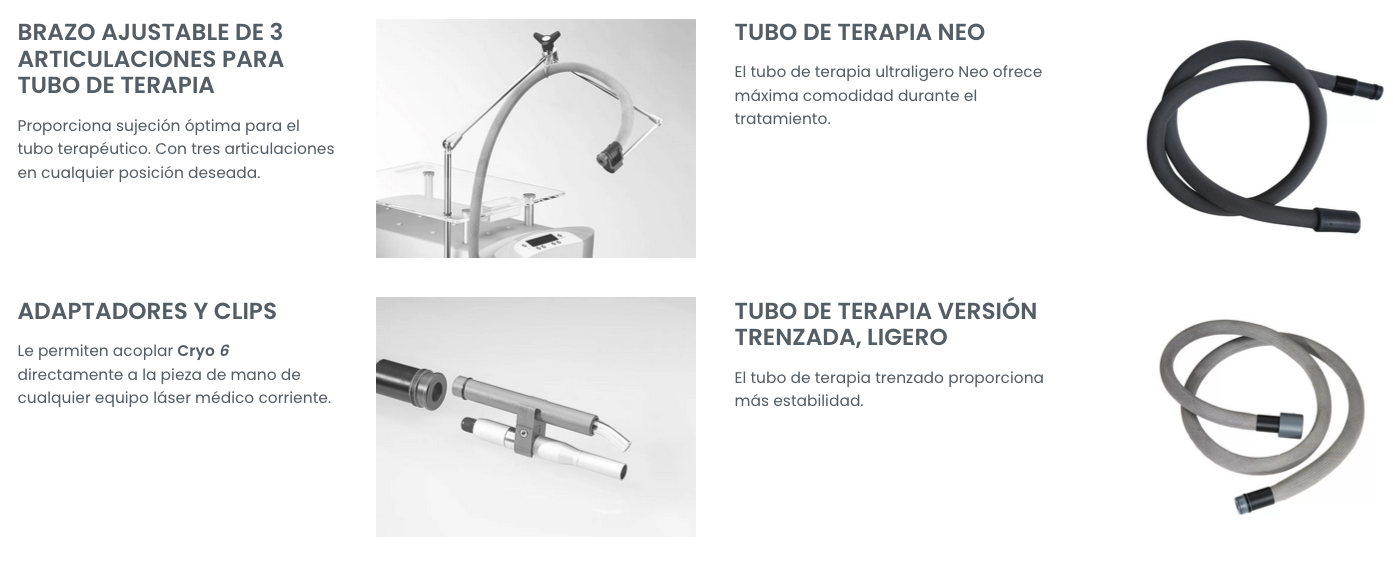 • Flexible: Cryo 6 proporciona libertad de diseño: con su versátil placa de vidrio, el brazo de soporte opcional para tratamientos manos libres o con clips y adaptadores para acoplar el tubo de aire a las piezas de mano de los equipos láser corrientes.