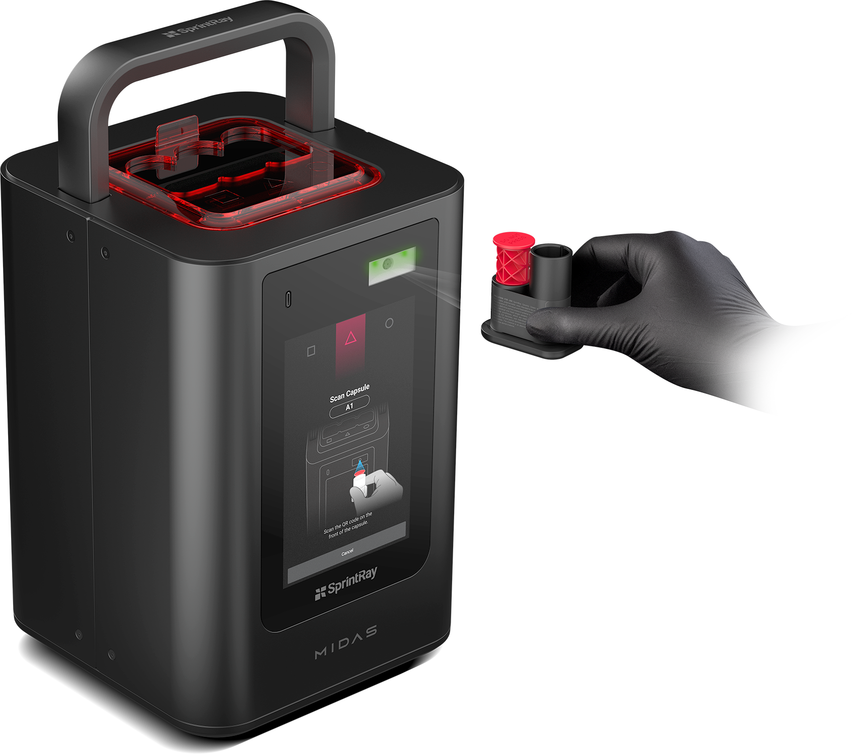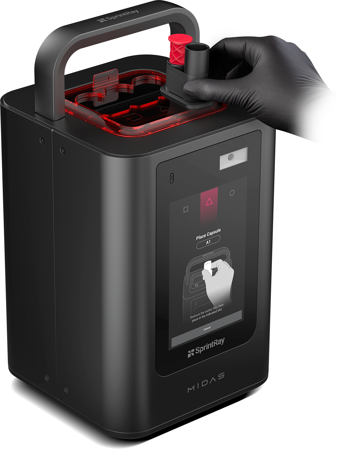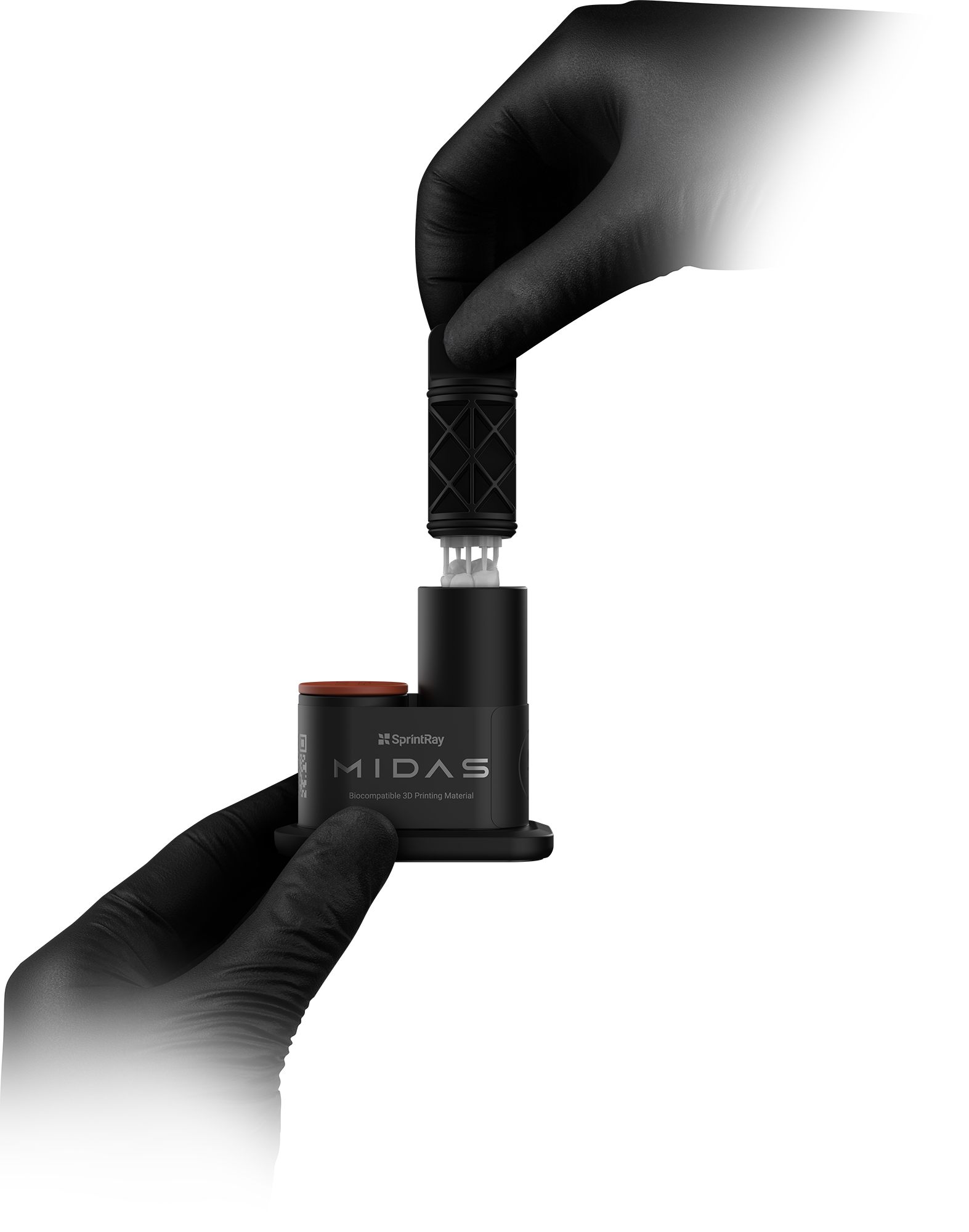 Envía el diseño de tu corona directamente a Midas para imprimirlo en menos de 10 minutos: así es el servicio en el mismo día. Cualquiera puede imprimir una restauración en Midas. Al usar cápsulas de resina en lugar de botellas y tanques, la impresión es tan sencilla como prepararse el café de la mañana.