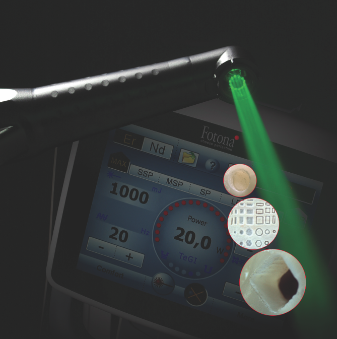 Las tecnologías patentadas VSP (pulso cuadrado variable) y SMOOTH de Fotona mejoran al máximo la precisión, el rendimiento y la seguridad de los tratamientos dentales con láser. El VSP permite a los profesionales controlar con precisión la duración del pulso del láser y su intensidad de acuerdo con las necesidades de la aplicación específica, con sólo pulsar un botón.