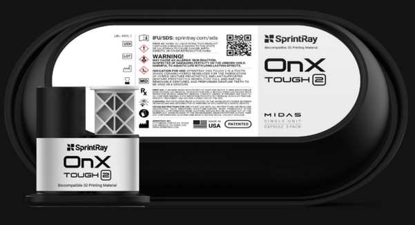 SprintRay OnX Tough 2 es una resina innovadora que ha recibido la autorización de la MDR para su uso en la creación de prótesis híbridas fijas. Este material utiliza la tecnología de vanguardia NanoFusion™, que ofrece una durabilidad y una calidad visual excepcionales. El resultado es un aspecto extraordinariamente real que se asemeja al esmalte natural.